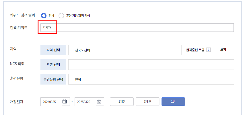 국민내일배움 공제를 통해 국비지원을 받아 학원비용을 할인 받으시려면 국비지원 교육기관(학원)을 찾아 수강신청 하시면 됩니다. 한국직업훈련포털에서 검색키워드에 '지게차'를 넣고 지역을 설정하여 검색하면 내 주변 인근의 지게차 학원 리스트가 나옵니다.
